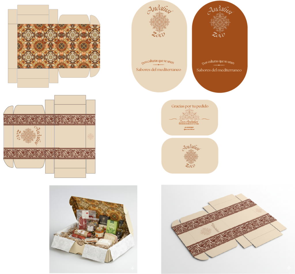 La identidad de Zoco Andalusí se construye desde el contraste armonioso: la calidez mediterránea y la riqueza ornamental árabe. Un logotipo firme y elegante actúa como ancla, mientras los patrones recuerdan el mosaico, la filigrana y los textiles tradicionales, usados con equilibrio para mantener una estética moderna. La paleta se mueve entre neutros cálidos (arena, crema) y tonos profundos (tierra, canela, tinta), evocando especias, cerámica y papel. En impresión y packaging, los acabados táctiles —papeles texturizados, relieves sutiles, tintas especiales— elevan cada pieza, haciendo que comprar en Zoco Andalusí se sienta como abrir una pequeña puerta a un mercado lleno de sabor y belleza.